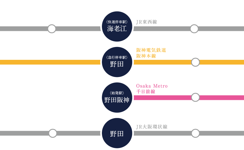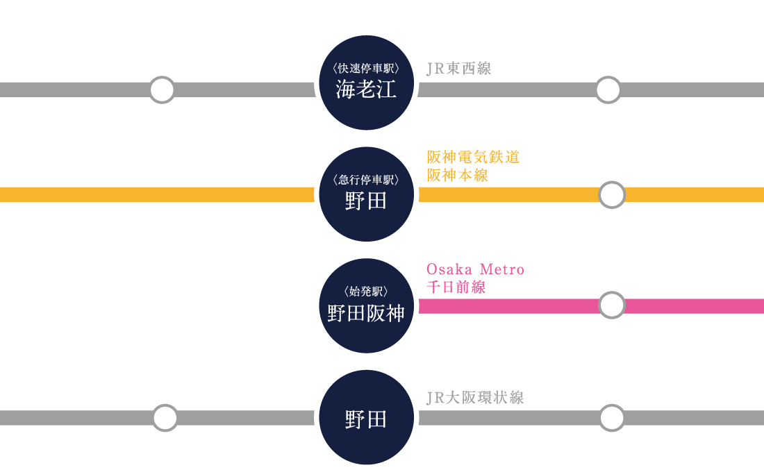 - ■ Osaka Metro千日前線「野田阪神」駅 8号出入口より徒歩8分 ■ JR大阪環状線線「野田」駅より 徒歩9分(約720m) ■ 阪神なんば線「西九条」駅 ①出入口より徒歩13分(約1,040m)